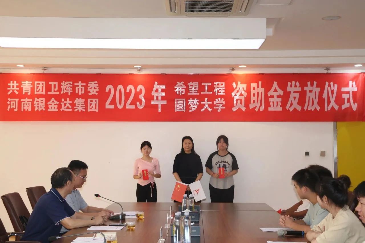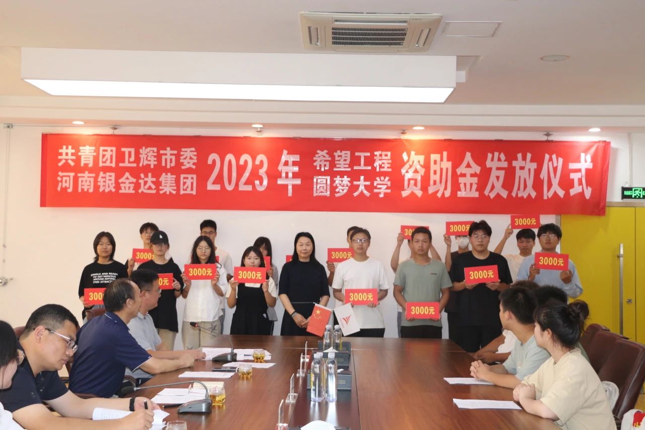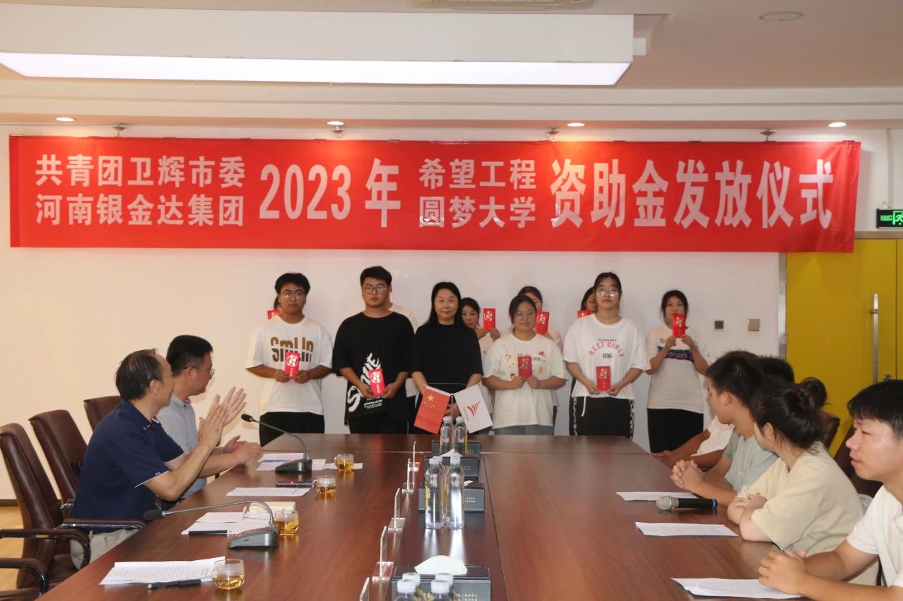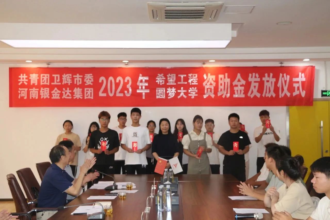 8月18日,共青團衛輝市委、河南銀金達集團2023年“希望工程·圓夢大學”資助金發放儀式在達新源公司三樓會議室舉行,衛輝市委常委、副市長魏克濤、共青團衛輝市委書記鄭鑫、河南銀金達集團黨委書記、董事長閆銀鳳、河南銀金達集團黨委副書記、工會主席楊鳳瑞出席儀式,2023年受資助的71名困難大學生和部分學生家長代表參加,儀式由河南銀金達集團文化宣教中心主任助理高嵩主持。